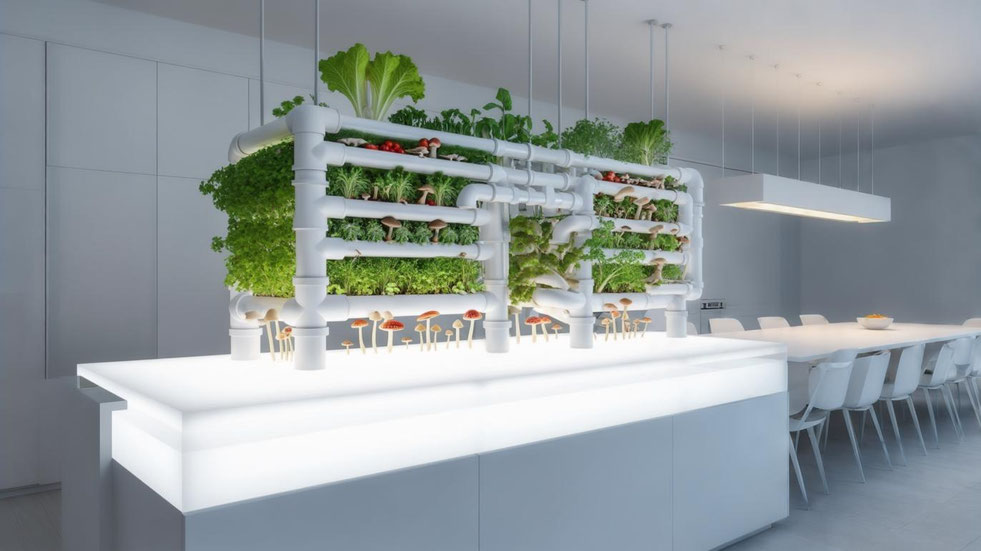 System mit Nahrung versorgt wird. Auf der Tischfläche entsteht eine skulpturale Struktur, die an zukünftige Formen der Kultivierung erinnert.